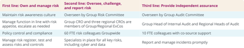 To make sure we align to our Group Risk Framework and our appetite for risk, we organize our risk management using the Three Lines of Defence model. Each line has clearly defined roles, responsibilities, and accountabilities.